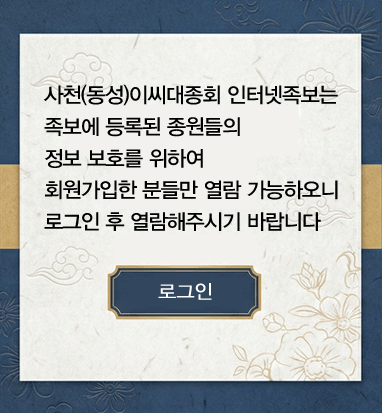 대종회소개 회장 인사말 역대회장명단 조직기구표 임원명단 파별 문중 종친회 지역 화수회 종훈 · 종헌 대종회기 규 약 사천(동성)이씨사 연표 홈페이지관리규약 찾아오시는 길 뿌리탐구 사천(동성)이씨유래 시 조 파 조 자랑스러운 후예 향사일정 항렬표 유물·사적 인터넷족보 인터넷족보열람 화보 및 문헌 인터넷족보소식 족보편찬안내문 신청서작성요령 신청서작성견본 등재신청서양식 협찬하신 분 대종회자료실 뿌리소식지 구 족보 기타자료실 문헌 자료실 전통자료실 계촌법 고금관작대조표 동서양연대대조표 간지대조표 관혼상제 이름의유래 족보상식 방위도 24절기 경조문 제사상차리는법 지방작성법 열린마당 공지사항 다양한 자료실 새소식 인물동정 업데이트소식 사진갤러리 자유게시판 인터넷족보열람 HOME > 인터넷족보열람 상단으로
